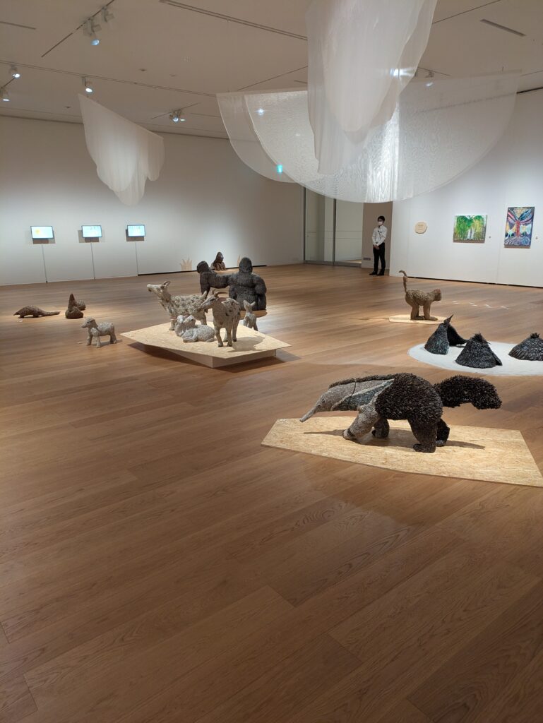 展示室に入ると、色鮮やかな絵や立体作品、思わず触れてみたくなるような造形が並び、まるで絵本の中に入り込んだよう。動物で身近な存在から初めて見る不思議な生き物まで、多彩な作品に子どもは目を輝かせていました。