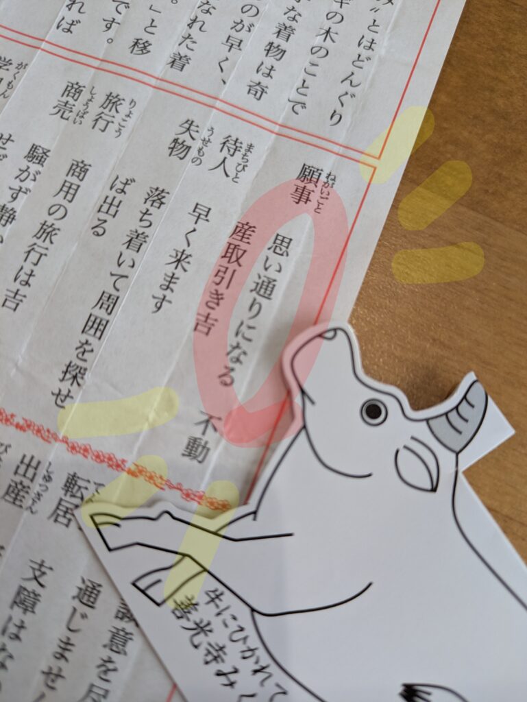 型紙でできた牛が、背中におみくじを背負っているような形で、