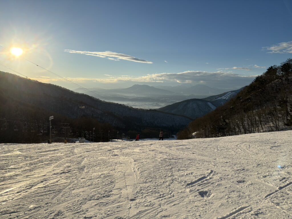 ゲレンデに立つと、雪に覆われた山々の景色が広がり、思わず立ち止まって見入ってしまいます。冷たい空気の中で見る景色はとても綺麗で、日常から少し離れたような感覚になります。この景色を見られるだけで「来てよかった」と思えました。