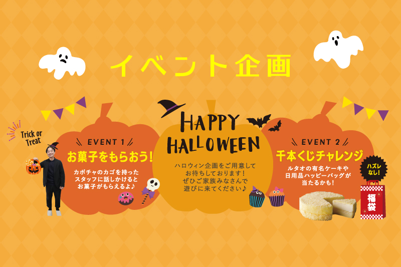 お子さまも大人の皆様も嬉しいハロウィン企画をご用意!お菓子や日用品の詰め合わせ、有名ブランドのケーキなどGETのチャンスです!