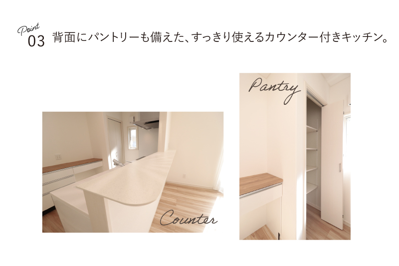 配膳やディスプレイなど多目的に使えるカウンターと、調味料やストックをまとめて収納できるパントリー付きで、キッチンまわりもすっきり整います。