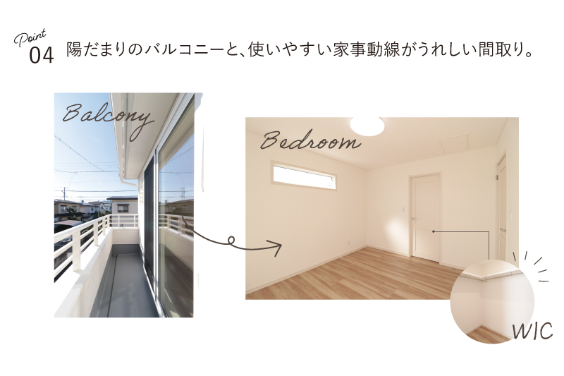 南面に設けた明るいバルコニーは主寝室とつながり、動線も快適。洗濯物を干して、そのままウォークインクローゼットへ片づけられます。