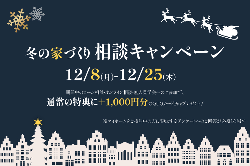 12月8日(月)~12月25日(木)まで、期間中にローン相談・オンライン相談・無人見学会へのご参加で、通常の特典に加えて+1,000円分のQUOカードPayをプレゼントいたします!