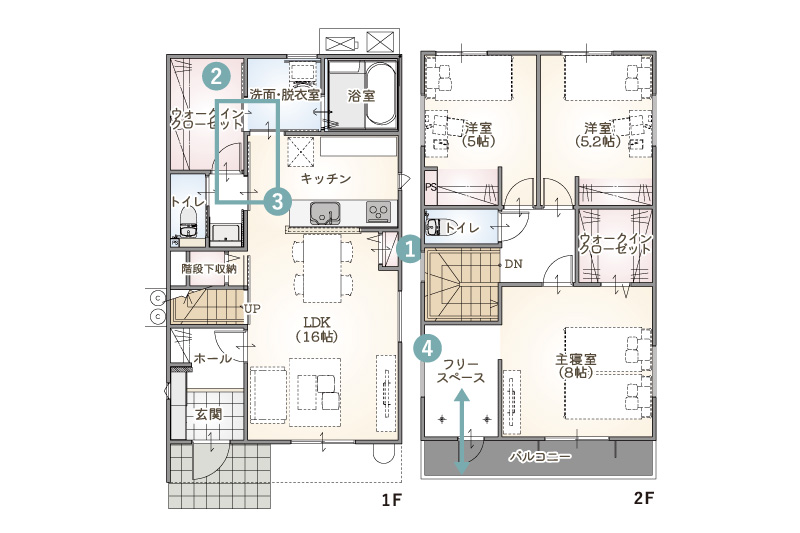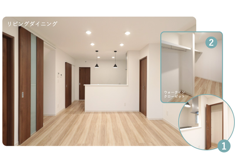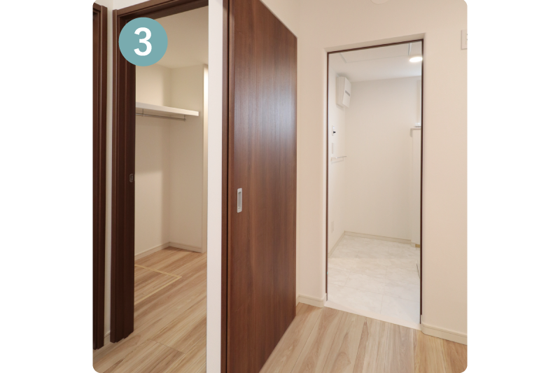 キッチン・脱衣室・ウォークイン・洗面をぐるっと回れる構造で、家事の同時進行がしやすい住まいです。