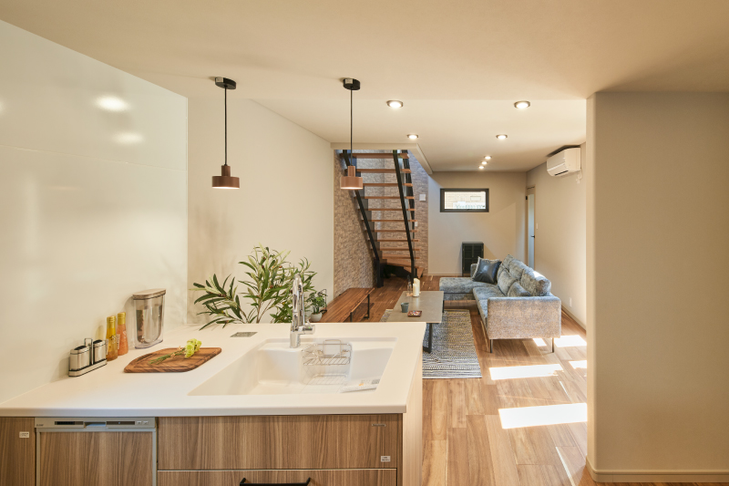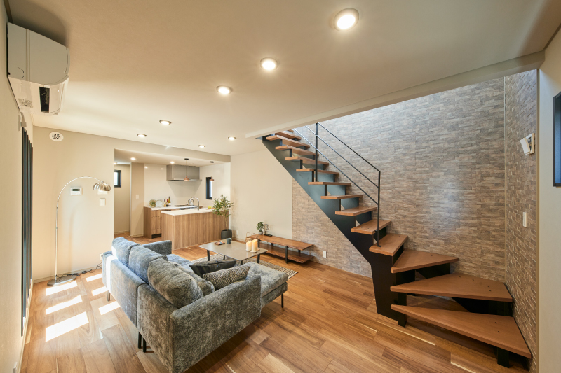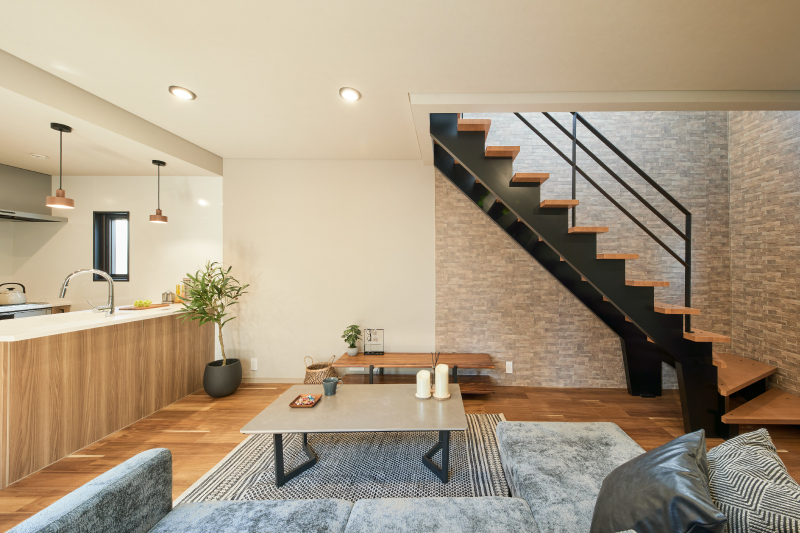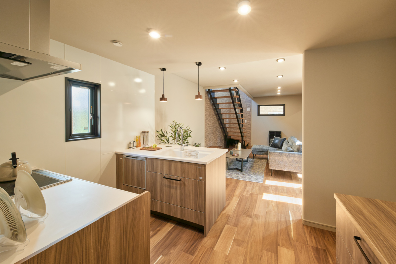 「階段もキッチンも、空間の一部」オープン階段とニの字型キッチンで、LDKに広がりと一体感をプラス。居心地の良い暮らしを演出します。
