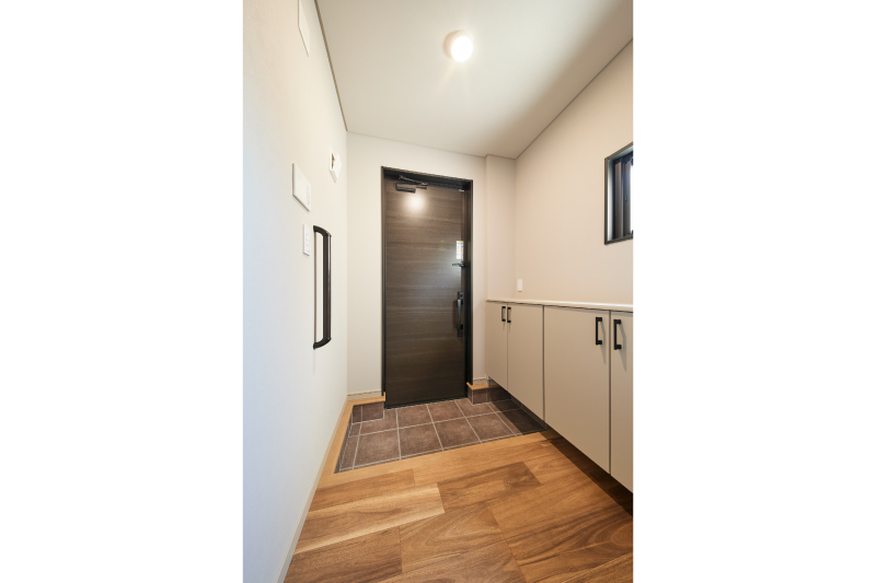【玄関】木目の美しさと白壁の明るさが調和する、すっきりとした玄関空間。