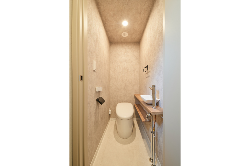【トイレ】グレーのクロスでまとめたシックな空間に、洗面台を備えた機能的なトイレです。