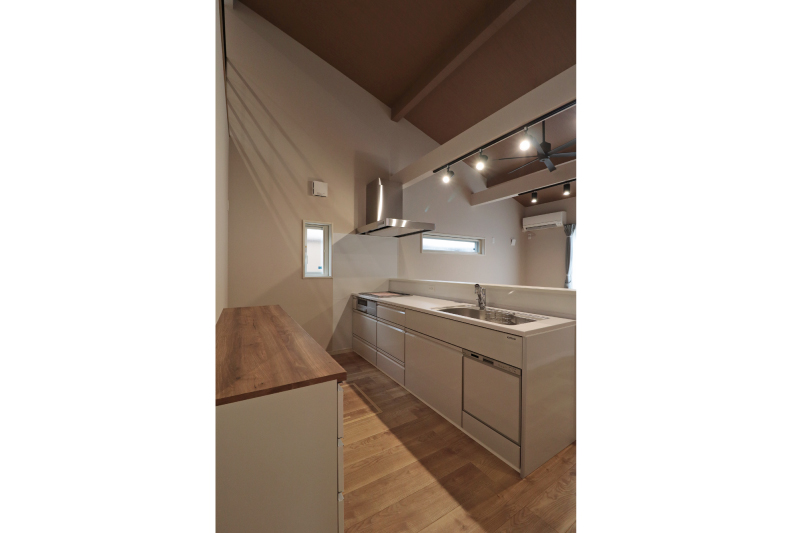 【キッチン】天井の高さに変化をつけたメリハリのあるキッチン空間です。