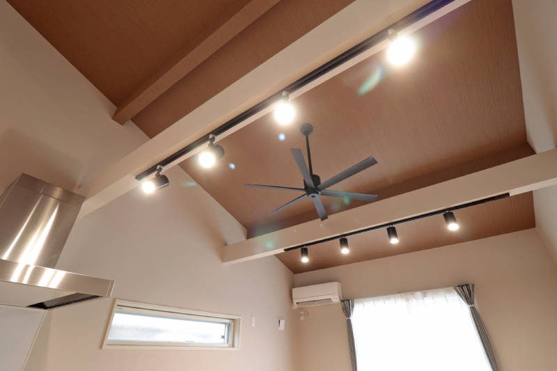 【LDK(12帖)】スポットライトに映える勾配天井がリビング空間を演出します。