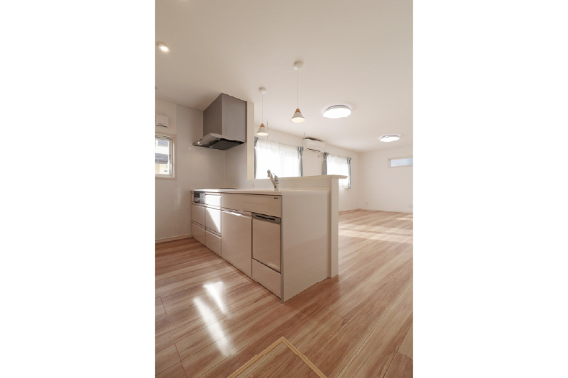 【キッチン】腰壁で生活感を抑えつつ、 LDKとのつながりを大切にした対面キッチンです。