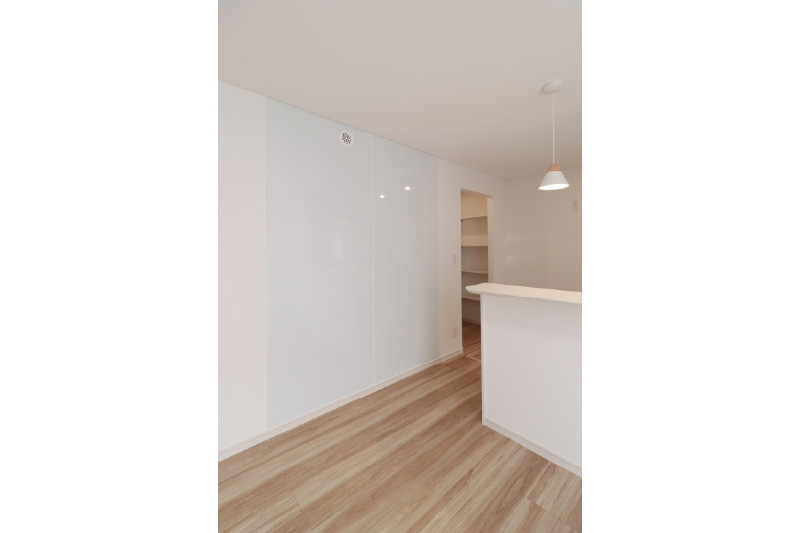 【LDK(18帖)】リビングの一角に設けたエマウォールは、マグネットが使える、すっきりとした壁面仕上げです。
