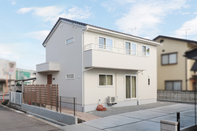 【外観】横に広がるバルコニーが印象的な、白基調のシンプルな外観です。