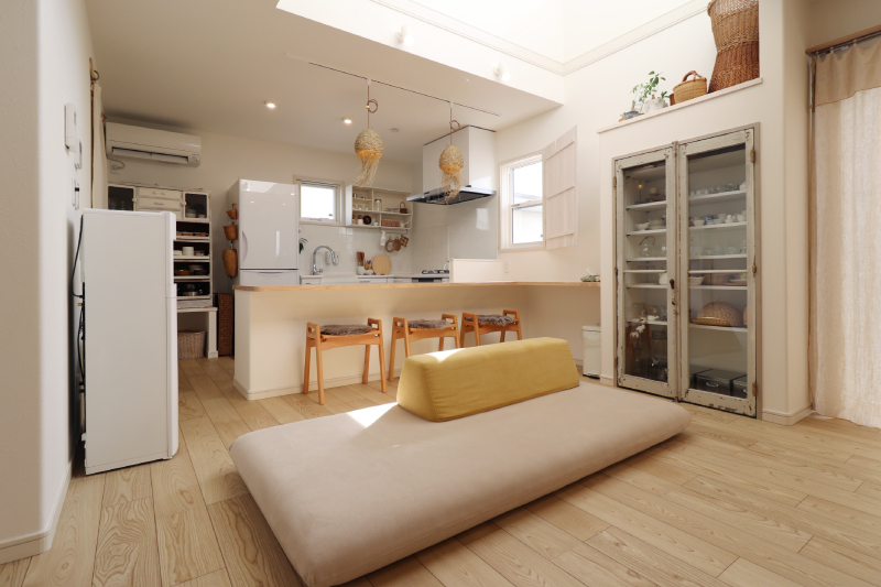 【LDK(15帖)】キッチンを中心に、素材感を活かした空間構成。 アンティーク扉の収納家具は、お施主様のご要望で設置しました。