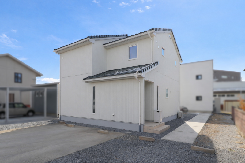 【外観】白を基調にした外壁。 凹凸のある形状で立体感を持たせた設計です。