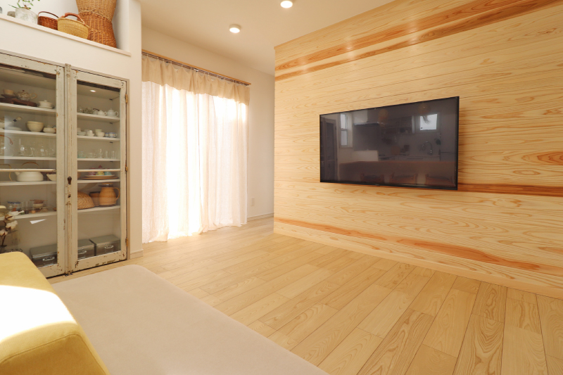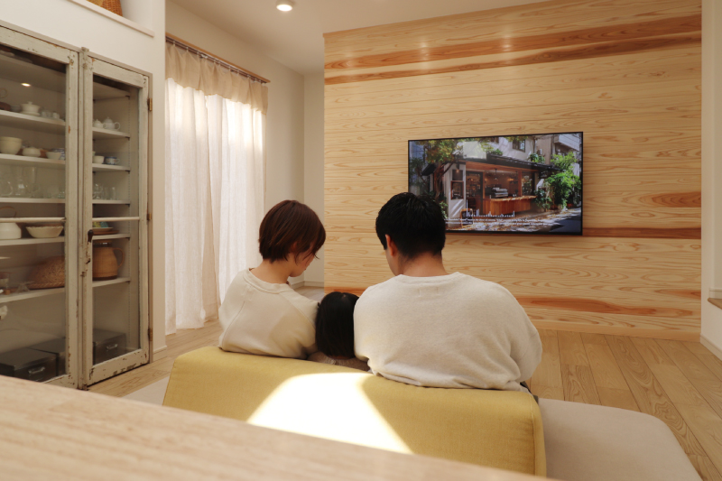 【LDK(15帖)】無垢材をあしらったテレビ背面のアクセントウォール。木のあたたかさに包まれながら、家族でくつろぐ時間が自然と生まれる空間です。