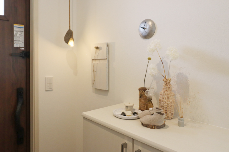 【玄関】ラタンやウッド素材の小物で、お施主様らしいナチュラルな世界観を表現しています。