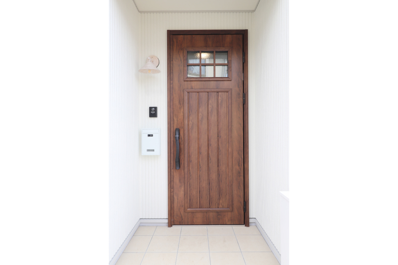 【玄関】白い外壁にブラウンの木目ドア。ナチュラルテイスト好きに刺さる組み合わせです。