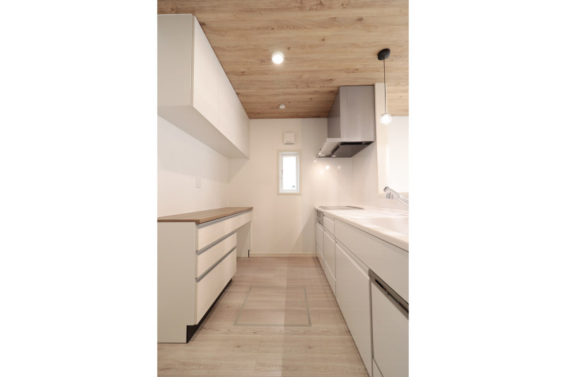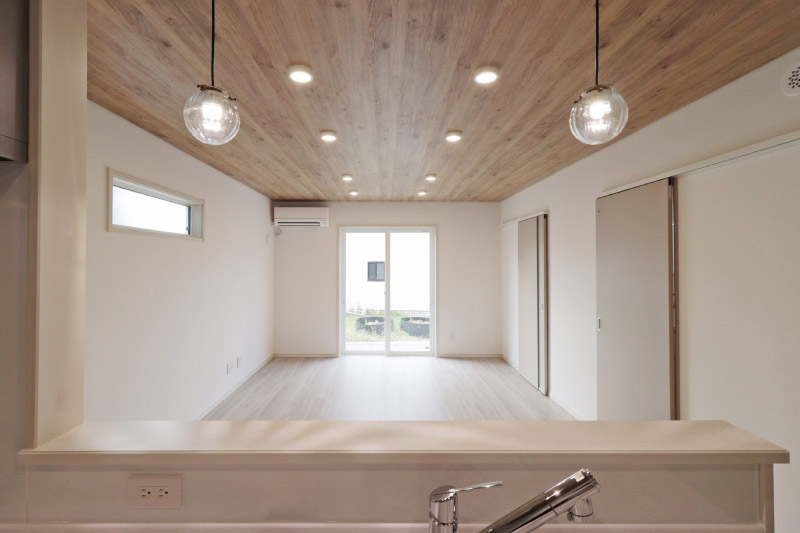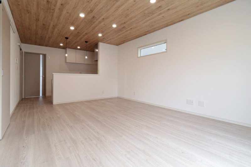 リビングとキッチンをゆるやかにつなぐレイアウトで、家族の会話が弾む設計。木目の天井があたたかさを感じさせ、心地よい時間を過ごせます。