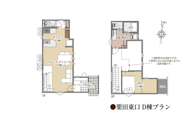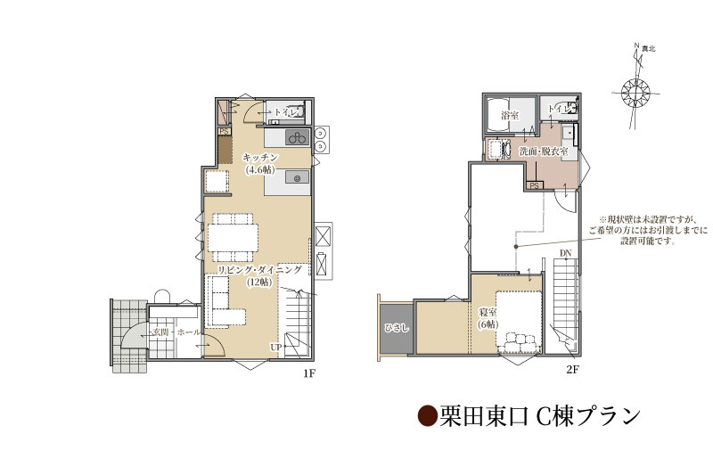 現在は1LDKの間取りですが、ご希望に応じて2階に壁を設け、2LDKとしてお引き渡しすることもできます。壁を追加するにあたって料金のご負担はなく、お引き渡しまでに設置対応いたします。